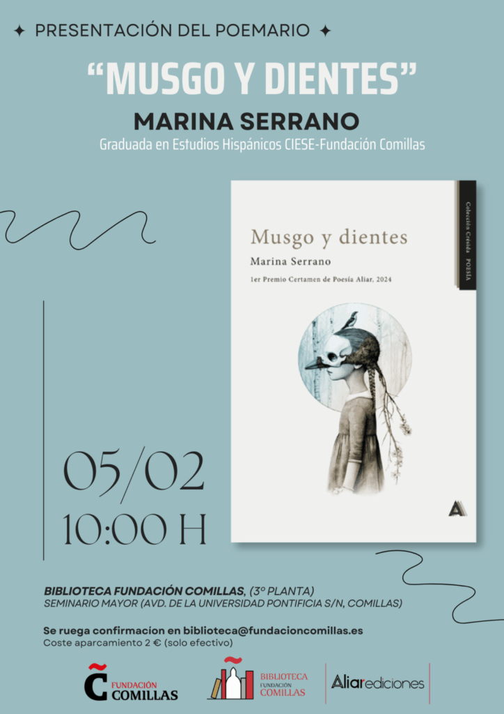 Marina Serano, graduada en Estudios Hispánicos por el CIESE-Fundación Comillas, presentará su pomeria "Musgo y dientes" en la Biblioteca de la Fundación Comillas (3ª planta del Seminario Mayor). . Esta obra ha sido distinguida con el 1º Premio del Certamen de Poesía Aliar, 2024. El acto, tendrá lugar el jueves 05 de febrero, a las 10:00 horas en la Biblioteca del CIESE-Fundación Comillas. Durante el encuentro, la autora, nos presentará su poemario y estará acompañada por Arancha Sanz Álvarez y Alejandro Coterillo Arozamena, los profesores de Literatura del centro. Además, el público asistente tendrá la oportunidad de participar activamente, planteando preguntas y compartiendo impresiones. A la finalización del acto, la autora firmará ejemplares ¡no te lo pierdas! El acceso es libre hasta completar el aforo. Se ruega confirmación en: biblioteca@fundacioncomillas.es) para una mejor organización del acto. Coste del aparcamiento: 2€ (solo efectivo). |
